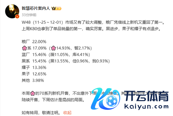 2024年第48周,小米REDMI K80系列发布并全渠说念开售,成为了上周中国手机阛阓单品销量第一的机型,小米也借此重回中国手机阛阓份额第一。不外,接头到华为Mate 70系列将于第49周开售,展望2024年第49周华为将成为中国手机阛阓份额第一。