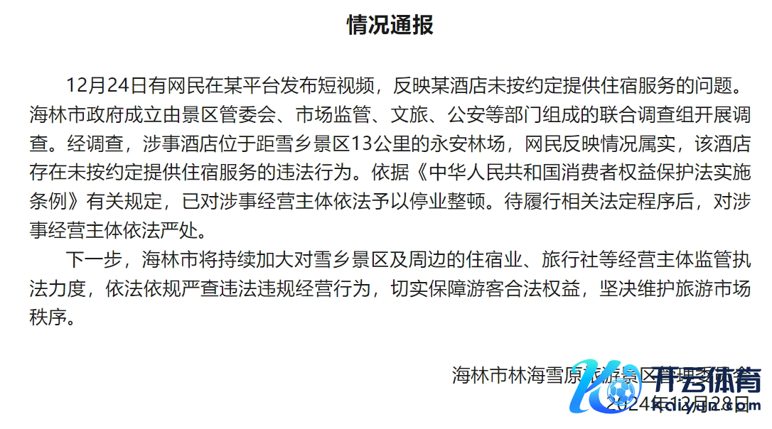 据海林发布微信公众号12月28日音尘,12月24日有网民在某平台发布短视频,反应某栈房未按商定提供住宿做事的问题。海林市政府建造由景区管委会、市集监管、文旅、公安等部门构成的邻接探望组开展探望。经探望,涉事栈房位于距雪乡景区13公里的永安林场,网民反应情况属实,该栈房存在未按商定提供住宿做事的违警举止。依据《中华东谈主民共和国破钞者职权保护法现实条例》琢磨规矩,已对涉事操办主体照章赐与歇业整顿。待履行相干法定步骤后,对涉事操办主体照章严办。 下一步,海林市将捏续加大对雪乡景区及控制的住宿业、旅行社等操办主体监管王法力度,照章依规严查违警违纪操办举止,切实保险旅客正当职权,坚毅景仰旅游市集治安。 ![]() 据新黄河,有网友此前发视频称,我方在海林市林海雪原景区预订了三千元的住宿,次日入住被条款另搪塞钱。 逐日经济新闻详细自海林发布微信公众号、新黄河开yun体育网 |