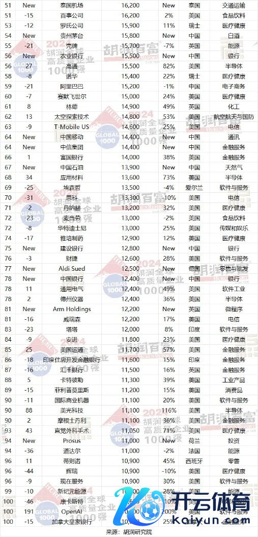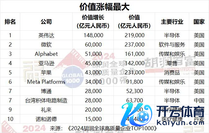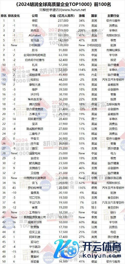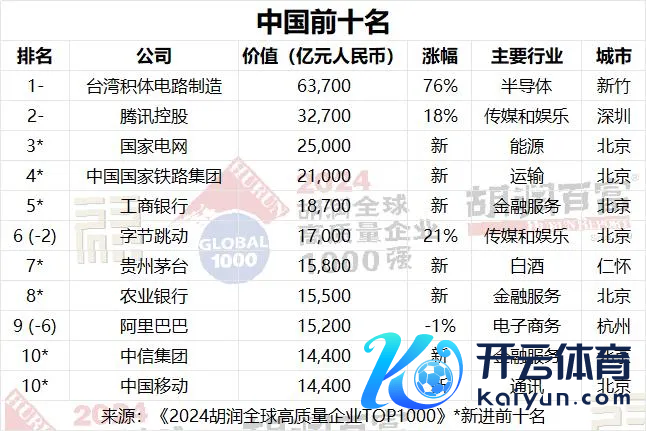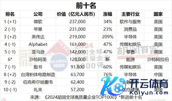 1月14日,胡润参谋院发布《2024胡润人人高质地企业TOP1000》。与《胡润寰宇500强》比较,这次上榜公司数目从500家增至1000家开yun体育网,并初度将国有企业纳入榜单。 榜片面,微软位列人人价值最高的公司,总价值为23.7万亿元东谈主民币。中国企业台积电、腾讯、国度电网、中国国度铁路集团、工商银行等名次靠前。 河南共有两家企业上榜,其中牧原集团以总价值2000亿元并排第741名,洛阳钼业并排912名,总价值1550亿元。 微软超越苹果,位居人人第一 大河财立方记者梳理榜单了解到,本年胡润人人高质地企业TOP1000上榜门槛为1400亿元东谈主民币,总价值达到617万亿元东谈主民币,共有502张新面貌。 收获于AI和云计较的强盛激动,微软超越苹果,成为人人价值最高的公司,价值达到23.7万亿元东谈主民币,同比增长34%。英伟达高涨两位至第三,其价值在夙昔一年中平均每天加多420亿元,达到21.9万亿元。Alphabet的价值加多了5万亿元,达到16万亿元,亚马逊的价值加多了4.5万亿元,达到14万亿元,两家公司皆位居前五名。随后名次的为沙特阿好意思、脸书、台积电、伯克希尔哈萨韦、利来。 ![]() 前十名的总价值为139万亿元东谈主民币,占胡润人人高质地企业TOP1000总价值的22%。前十名的平均涨幅为63%。8家来自好意思国,沙特阿拉伯和中国各有一家,其中沙特阿好意思是前十名中独一的国有企业。 胡润百富董事长兼首席调研官胡润暗示:“TOP1000榜单中的公司组成了寰宇经济的坚实基石。榜单公司总销售额接近300万亿元东谈主民币,简略是中国和印度GDP总数的两倍,同期雇佣了8000万名职工,与英国和法国的工作东谈主口总数终点。” 中国企业前10名公布 北京成为上榜企业最多的城市 榜单泄露,中国企业在榜单上的比例从7%高涨到13%,主如果由于加多了国有企业。中国的134家公司中,74家是国有企业,60家口角国有企业。 表现最佳的是台湾半导体公司台积电(增长2.8万亿元)和联发科技(增长800亿元)。其他表现亮眼的公司包括腾讯(增长5000亿元)、鸿海精密(增长2400亿元)和好意思的(增长1400亿元)下滑赫然的,如农夫山泉(下落2000亿元)、盟国保障(下落1800亿元),以及网易、理念念汽车和拼多多。 ![]() 具体到中国企业前十名,划分为台积电、腾讯、国度电网、中国国度铁路集团、工商银行、字节提高、贵州茅台、农业银行、阿里巴巴、中信集团、中国出动。 企业总部方面,中国以134家公司位居第二,总价值65万亿元。好意思国以413家公司名秩序一,总价值348万亿元东谈主民币。日本名秩序三,有61家公司,总价值22万亿元。不外,总部方位城市方面,北京超越纽约,与东京并排第一。 ![]() 金融服务、动力、耗尽品、物流运载等位居行业前十,代表企业划分为工商银行、国度电网、好意思的集团、中国国度铁路集团等。 ![]() 中国上榜企业城市散布中,北京以48家位居第一,深圳为12家,其次为上海、香港、台北等。 河南共有两家企业上榜,其中总部在南阳的牧原集团,以总价值2000亿元并排第741名,洛阳钼业并排912名,总价值1550亿元。 ![]() ![]() AI本领大界限行使 金融服务业遥遥早先 AI本领的大界限行使,正激动经济力量的快速麇集,大型企业界限日益扩大。当今,榜单上已有7家价值非凡万亿好意思元的企业,而在2020年胡润寰宇500强初度发布时仅为4家。榜单前十名企业的总价值翻了一倍,从2020年的69万亿元东谈主民币激增至139万亿元东谈主民币,是印度GDP的五倍。 在夙昔一年中,半导体、金融服务(尤其是银行业)、医疗健康(尤其是制药和医疗建造)以及软件与服务行业表现强盛。好意思国的表现尤为杰出。相对而言,石油和自然气行业则经验了较为挑战性的一年。 在本年度涨幅最大的10家公司中,AI领域占据了8席,其中3家专注于算力,5家在软件服务领域。另外2家公司则来自医疗健康行业。英伟达是本年涨幅最大的公司,其价值加多了近15万亿元东谈主民币。 ![]() 金融服务行业无间保合手早先地位,共有210家公司上榜,总价值107万亿元东谈主民币。这一增长势头主要收获于数字金融和投钞票品需求的激增,以及金融科技在人人范围内的合手续膨胀。其次是动力行业,有115家公司,总价值64万亿元。 谁不才降? 榜单泄露,客岁上榜的116家公司价值下落,其中澳大利亚矿业巨头必和必拓的价值下落了4000亿元,降至1万亿元东谈主民币,主要受巨额商品价钱波动、中国需求减少以及环境资本高涨的影响。 自2019以来的5年里,价值下落最多的是好意思国数字支付平台PayPal,下落了1.4万亿元,三家好意思国电信公司Charter Communications、威瑞森和好意思国电话电报共下落1.7万亿元,文娱公司华特迪士尼和康卡斯特划分下落5900亿元,英特尔下落5700亿元,耐克下落5000亿元,辉瑞下落4400亿元。 ![]() 好意思国食物出产商玛氏降幅第二大,下落了3700亿元,降至6700亿元。聚拢健康集团的价值缩水3500亿元,降至3.1万亿元。香奈儿的价值减少了3200亿元,降至4250亿元。 据了解,本次榜单主要以企业市值或估值为依据,并概括考量立异才气、可合手续发展、社会包袱、阛阓影响力等多维度主义,以选出人人价值最高的1000家企业。上市公司市值按照2024年9月20日的收盘价计较,非上市公司估值参照同业业上市公司或最新一轮融资情况进行估算。 《2024胡润人人高质地企业TOP1000》前100名开yun体育网 ![]()